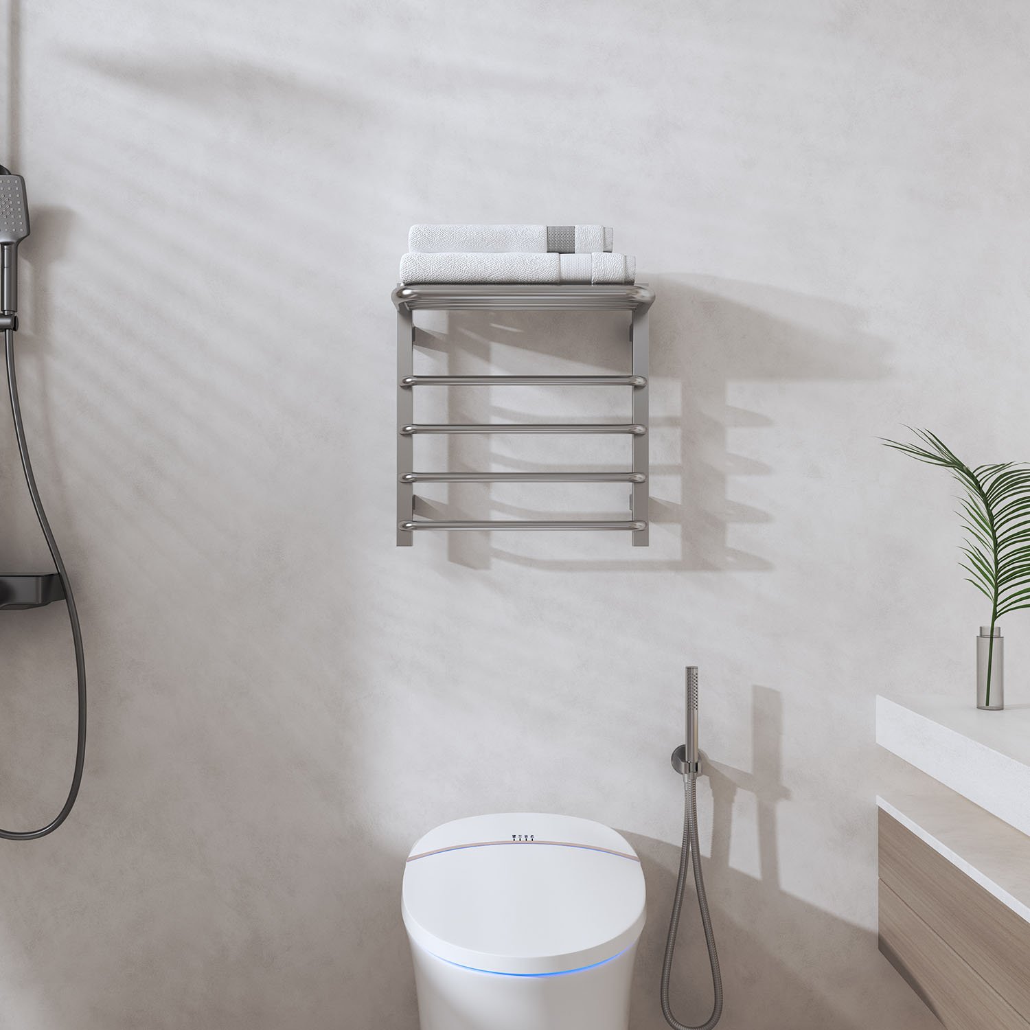 8桿時控開關(guān)電熱毛巾架 8 bar time switch heated towel rail 材質(zhì)Material:SS201/SS304 功率Power:220V/95W 表面Surface:Mirror Polished 鏡面拋光 尺寸Size:480*250*500mm 包裝Ctn size:500*270*530mm